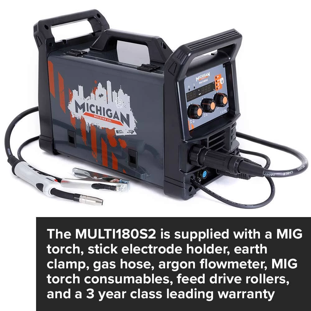 - The MULTI180S2 is supplied with a MIG torch, stick electrode holder, earth clamp, gas hose, argon flowmeter, MIG torch consumables, feed drive rollers, and a 3 year class leading warranty.